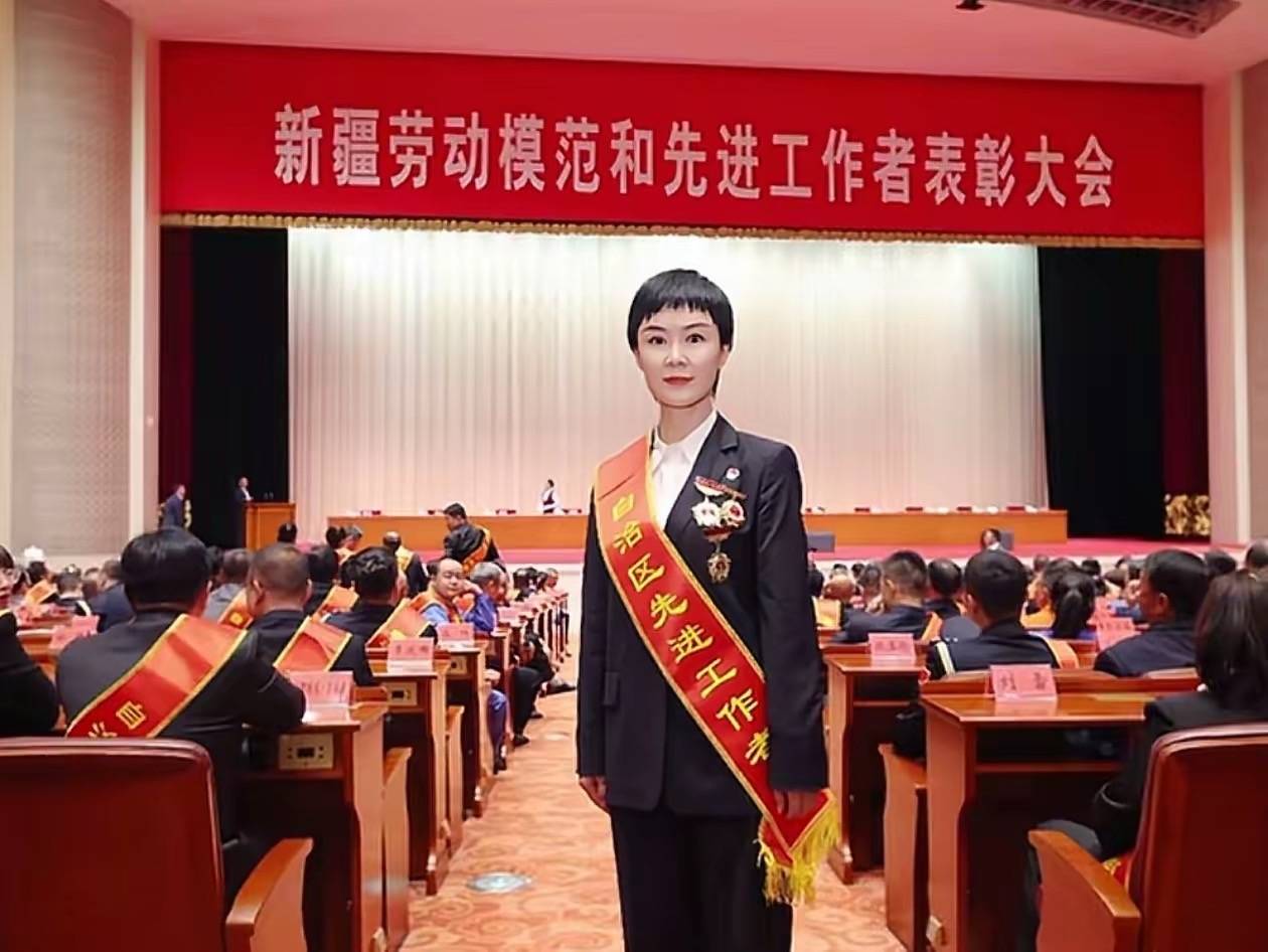 在劳动模范表彰大会上,她穿着正装、上台领奖,杰出的工作表现、让特被评为先进工作者。