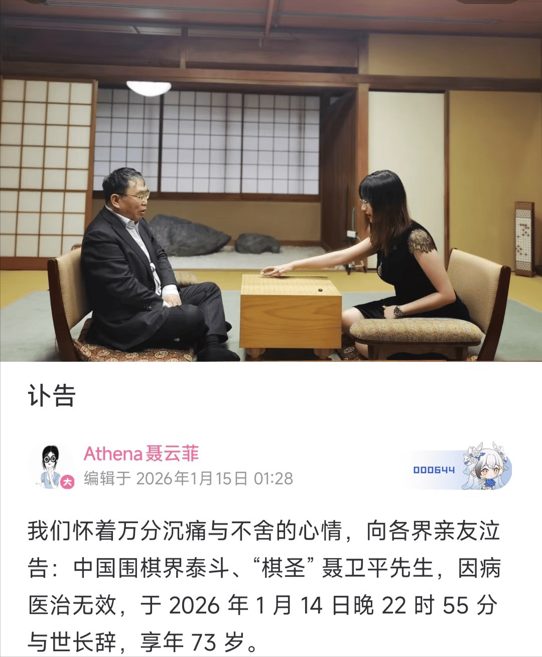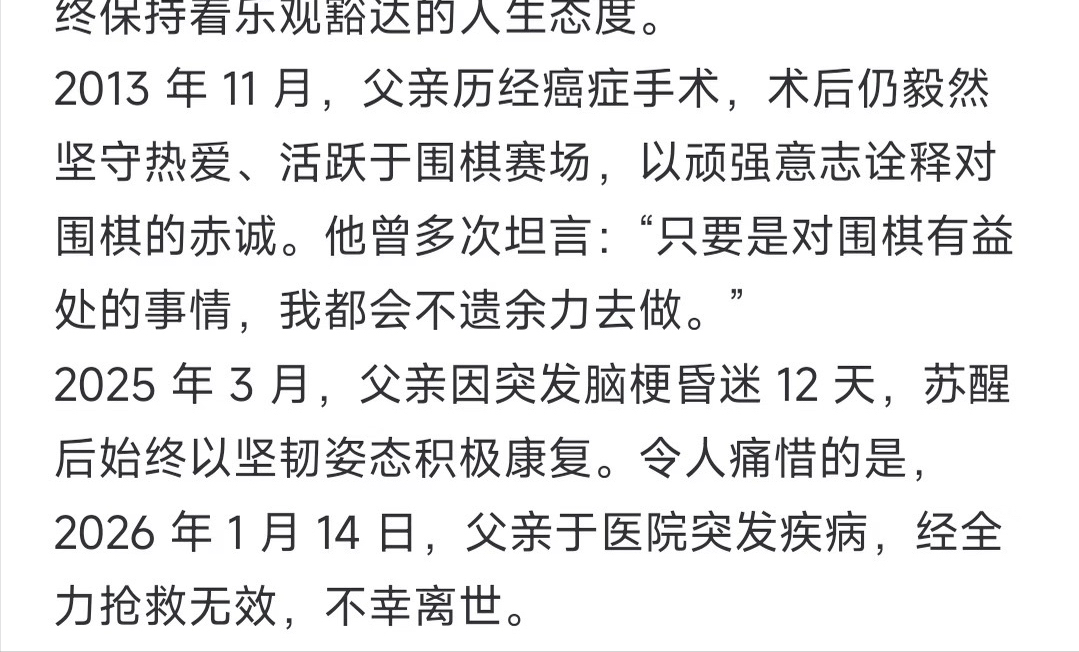 在八十年代力挽狂澜的“棋圣”聂卫平于2026年1月14日晚22时55分与世长辞,其女儿聂云菲发讣告。