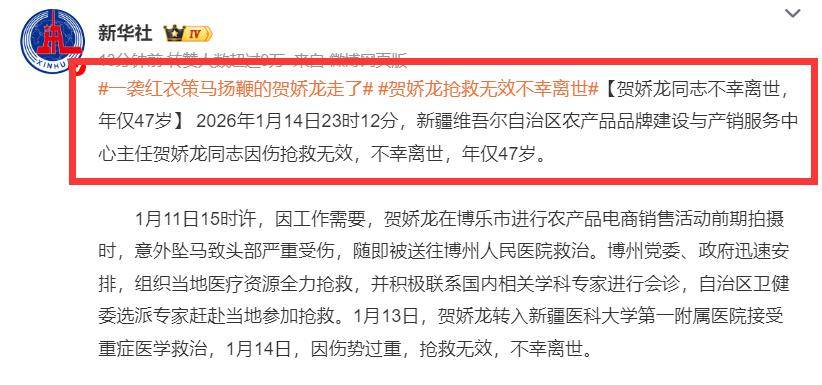 1月15日,令人遗憾的噩耗终究还是传来,经官方证实,网红副县长贺娇龙不幸离世,将生命永远定格在47岁。近日,贺娇龙不慎坠马的消息在外界掀起热议,1月11日,贺娇龙前往博乐市为电销工