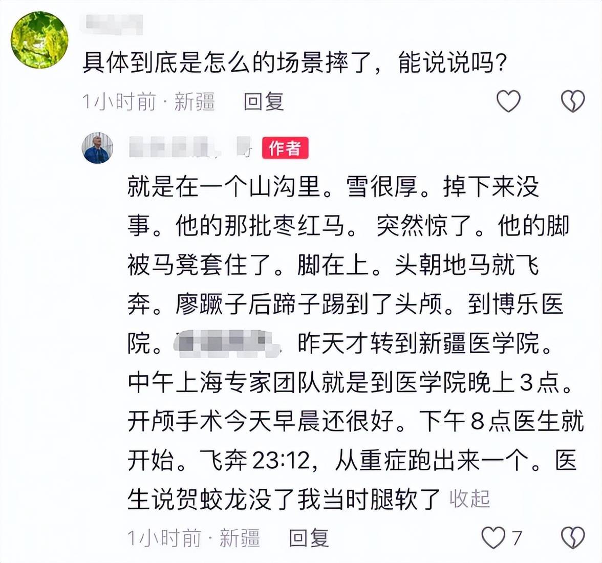 在评论区,好友透露了更多细节,告知当天贺娇龙在一个山沟里拍摄,雪很厚,掉下来没事,他的那匹枣红马突然惊了,她的脚被马凳套住了,脚在上,头朝地马就飞奔,廖蹶子后蹄子踢到了头颅。
