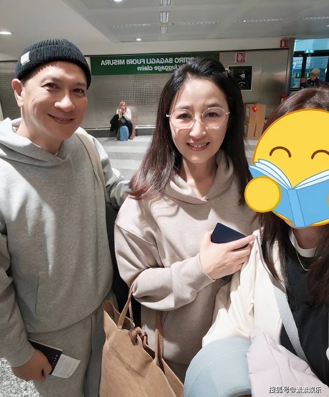 姐姐状态真好,发量浓密且状态自然。老公张家辉拿着机票护照站在旁边,戴着帽子的他状态也特别好。