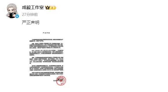 1月14日,成毅工作室在社交平台上发布严正声明,声明中表示成毅及家人持续遭受个别人员的跟踪与骚扰,实施包括但不仅限于尾随、围堵、在马路上追赶并试图逼停车辆等行为,甚至车辆