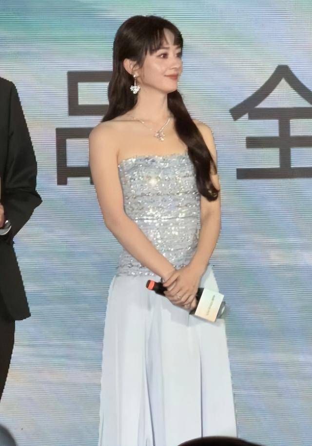 生图里的赵丽颖穿着定制款蓝色长裙,裙摆采用轻微的鱼尾设计,行走时刚好勾勒出腿部线条。