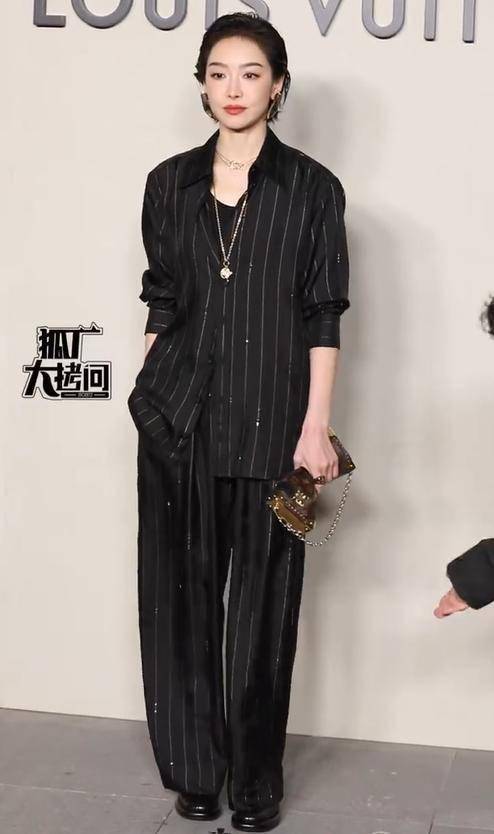 一整套柔软呢料抹胸配长裤,既展现了肩颈线,头肩比例太过完美,又让观众见识到了她独特又高级的审美。