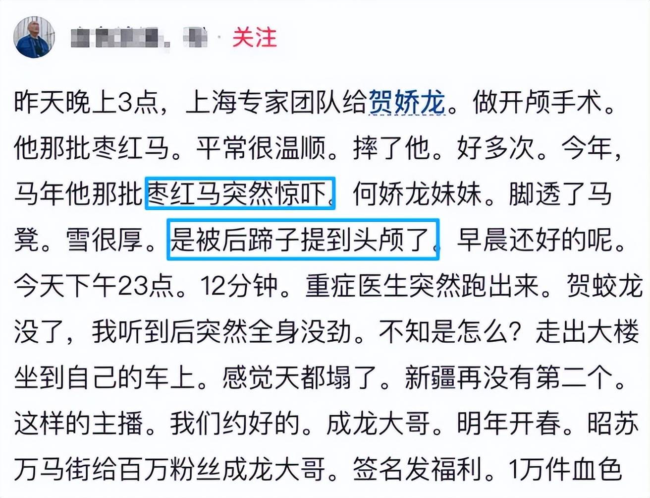 过程中,枣红马的后蹄又踢到了她的头颅,这才导致贺娇龙头部受到了重伤。