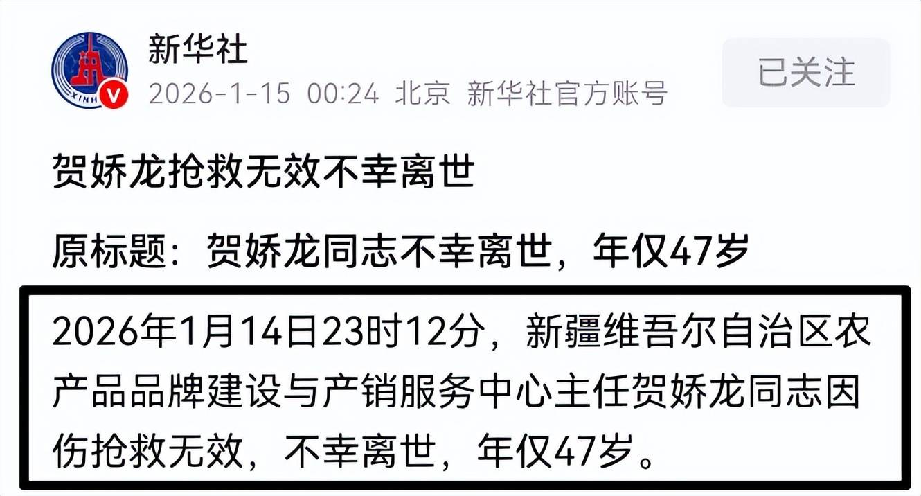 官方报道说,贺娇龙是在1月11日意外坠马,经抢救无效后,于1月14日晚23时离开了人世。
