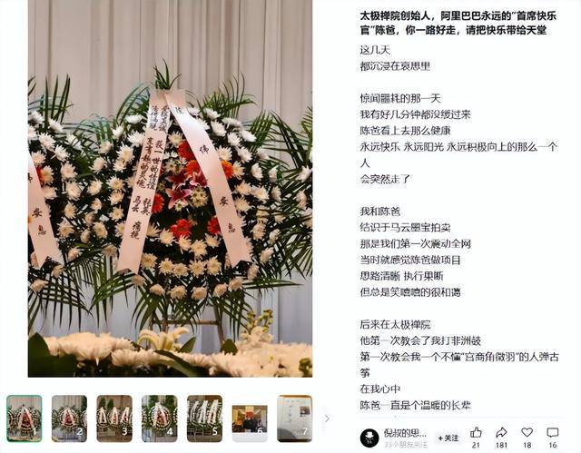 在陈伟的追悼会上,马云夫妇的挽联写着:“活得真诚,爱得洒脱;享有趣的灵魂,获一世的情谊。”
