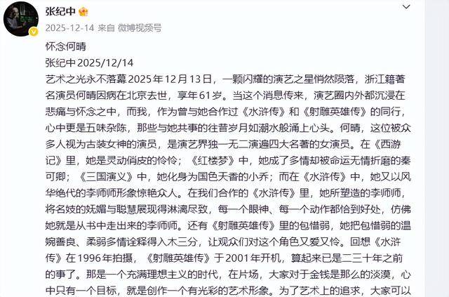 其实前段时间何晴去世的时候,张纪中就曾第一时间发长文悼念何晴,还将回顾了与何晴合作的两部经典作品。