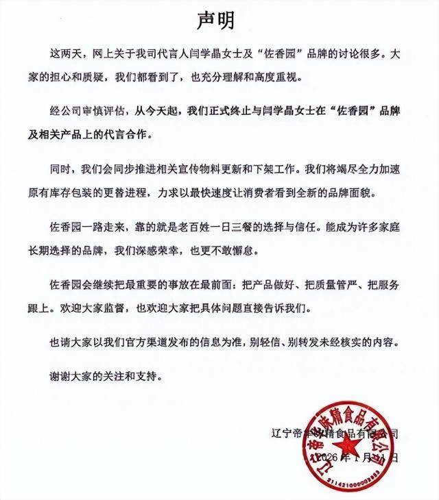 2026年1月11日凌晨,某味精食品有限公司一纸声明,正式宣布终止与闫学晶在某调料品牌上的所有代言合作。