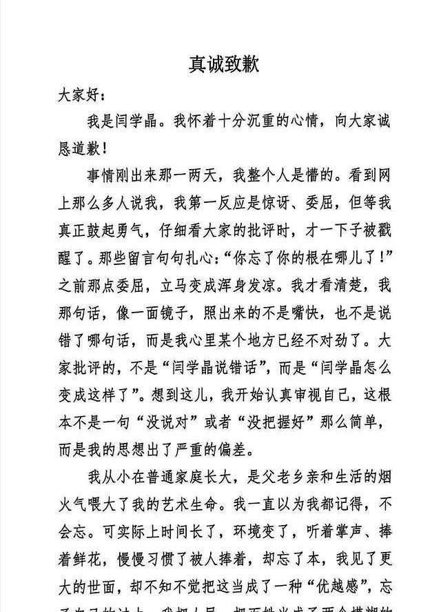 闫学晶在道歉信中也写道:“我忘记了自己的根,被掌声和鲜花捧得忘记本,思想出现了严重的偏差。”