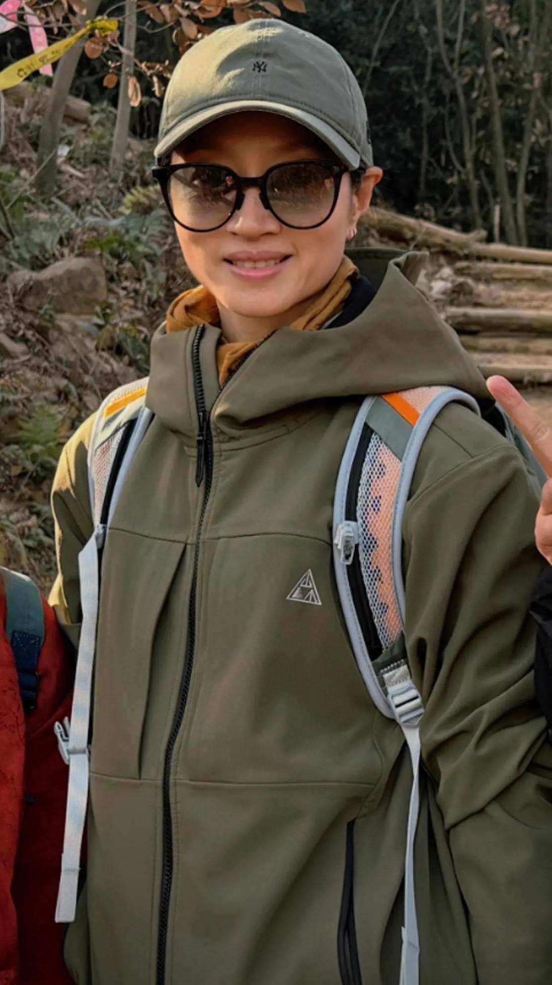 当天沈佳妮的穿搭特别接地气。一件绿色冲锋衣配藏蓝色工装裤,背上一个灰色双肩包,脸上架着大框黑墨镜。