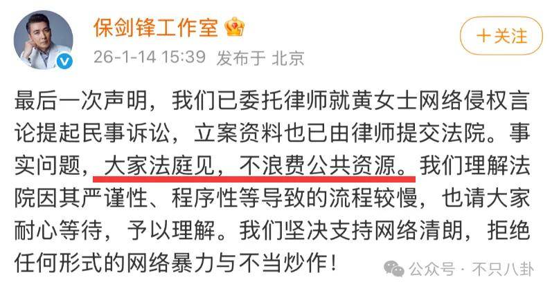 保剑锋工作室发布了最后一次声明,文字理性且冰冷,强调已经委托律师对黄慧颐提起民事诉讼,“大家法庭见”。