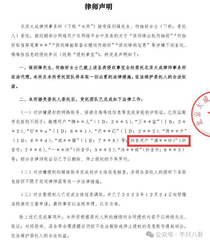 半个月后,保剑锋工作室再发声明,表示已经委托律师对诽谤及侮辱言论取证,其中就有黄慧颐的抖音账号。