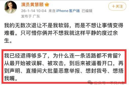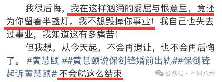黄慧颐的意思是,当年在一起时保剑锋劈腿何珈好,她选择放手成全二人。没想到20年后,她一开通短视频,对方就紧咬她不放。