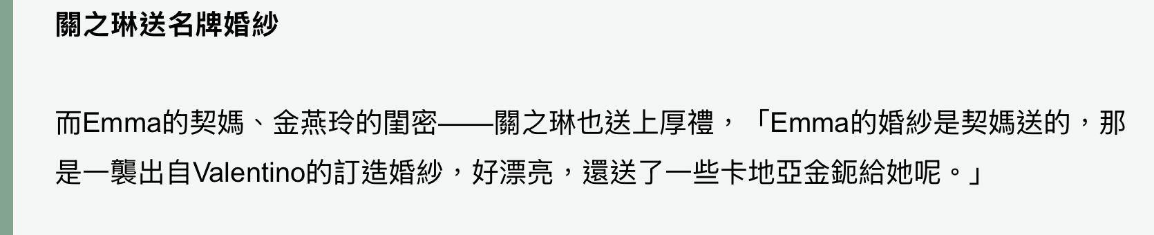 金燕玲还自曝,虽然婚礼没有参加,但是她的闺蜜们也有出钱出力助力女儿的婚礼。金燕玲自曝闺蜜关之琳送上了厚礼,女儿的婚纱就是关之琳送的,一套来自Valentino的高定,还送上了卡地亚的金饰,价值不菲,相当大手笔。关之琳是金燕玲女儿的干妈,实际上两人没有正式上契,不过没有关系。金燕玲称当年怀女儿的时候,就把关之琳的婴儿照放在自己床边,希望生出一个像关之琳这么漂亮的女儿,干妈与干女儿的关系就是这么来的。