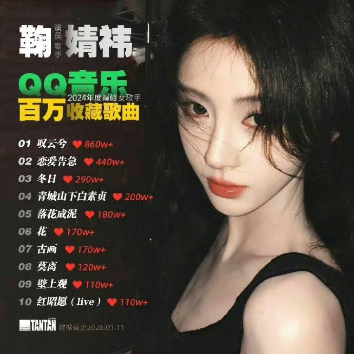 粉丝高频提及鞠婧祎2018年单曲《叹云兮》在QQ音乐、酷狗等三大平台累计收藏量突破2700万(酷狗单平台达1400万),成为长尾效应显著的代表作。