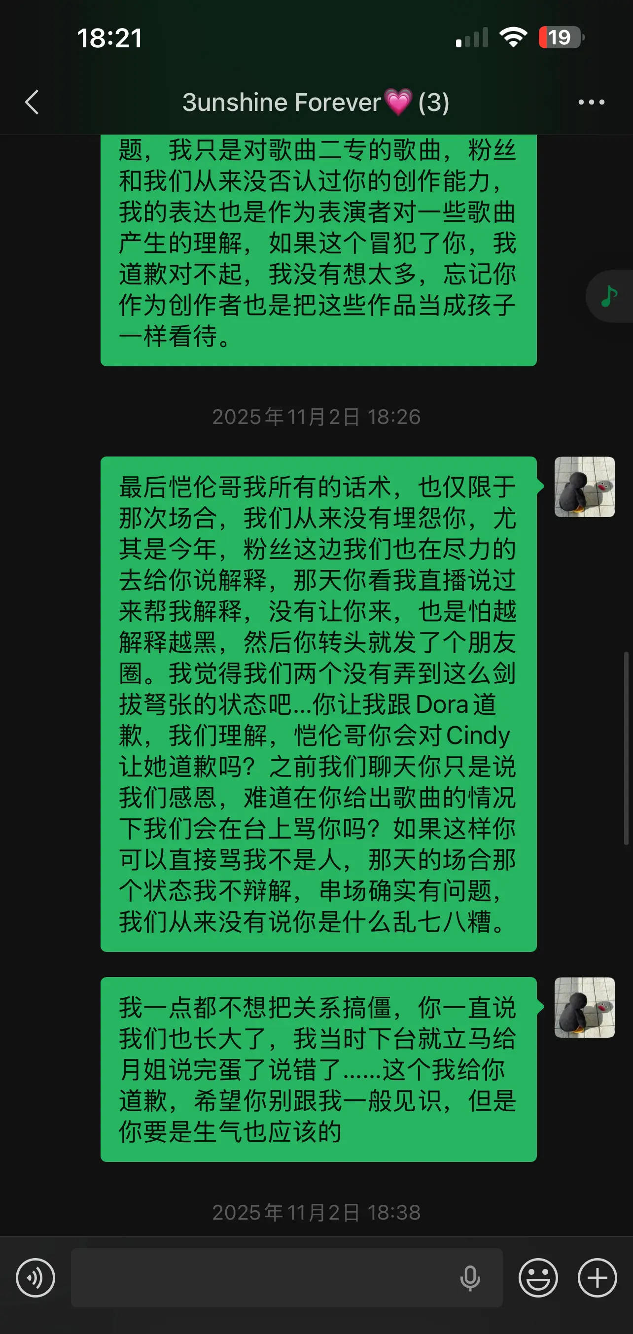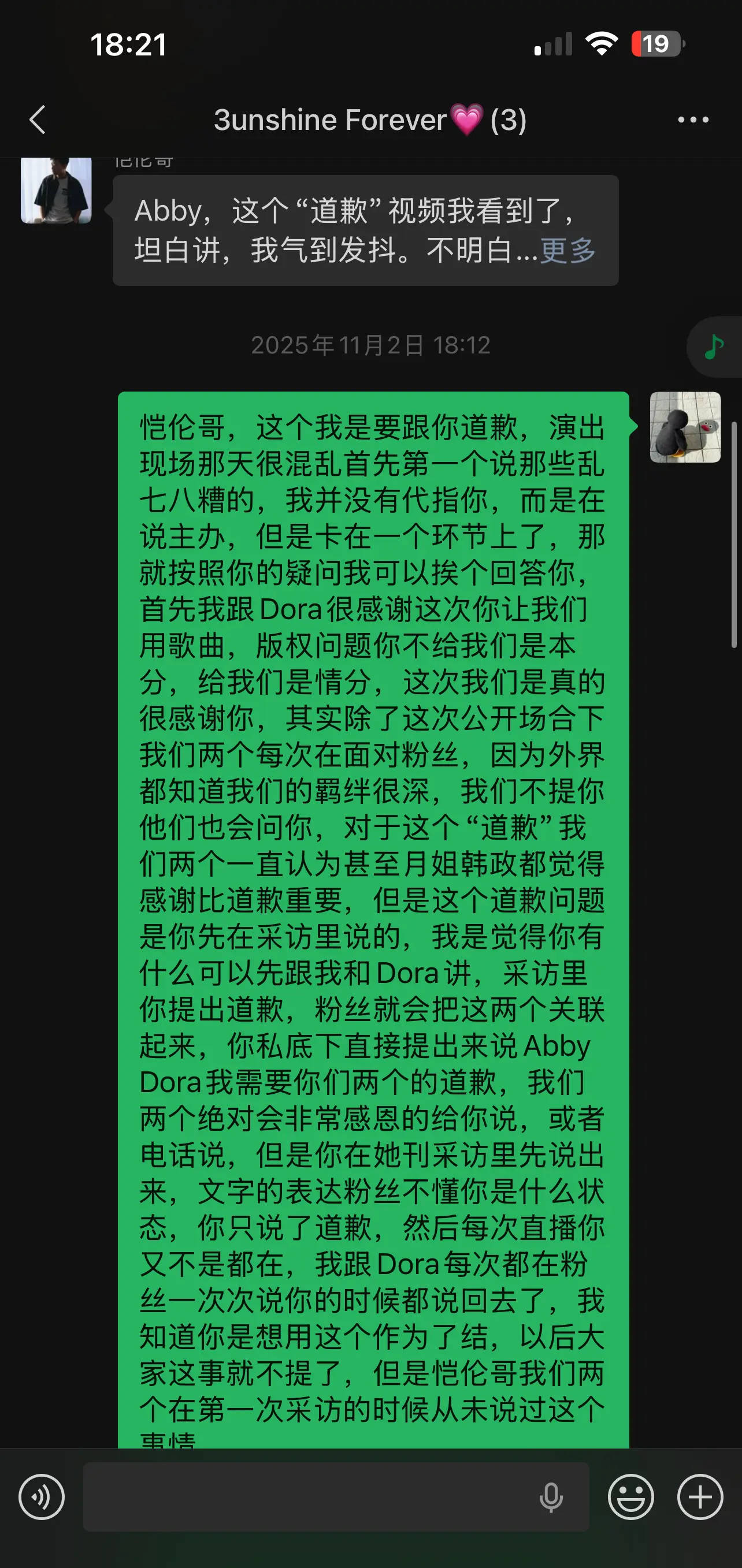 对此,3unshine队长Abby于15日发长文回应,称已与Dora沟通过,承认直播时没有制止把控他人言论是自己的问题,“未来我和Dora都希望彼此好。”