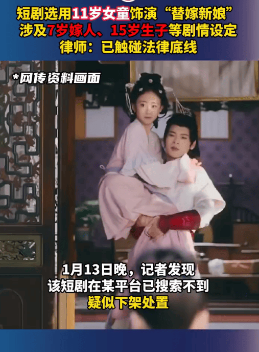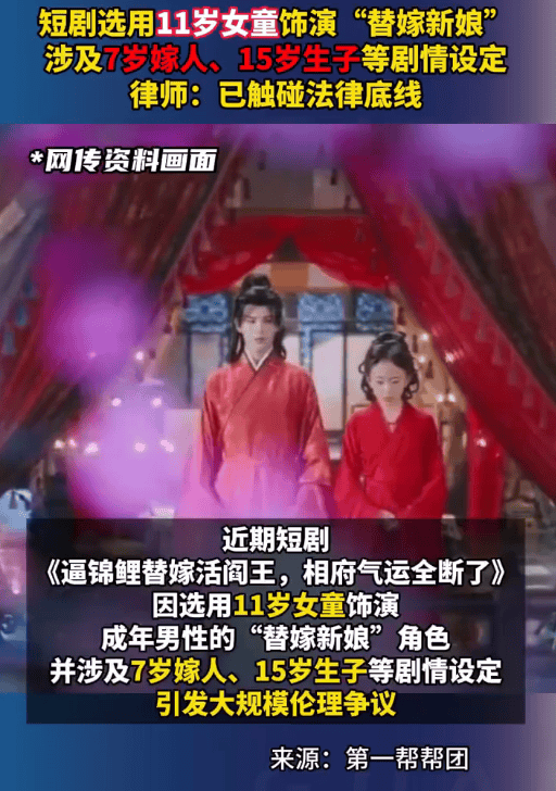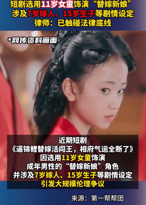 近期,一部短剧引发众怒。该剧选用了年仅11岁的女童饰演“替嫁新娘”,剧中角色设定为7岁被迫替姐出嫁,结局时15岁生子,与成年男演员组成夫妻关系。