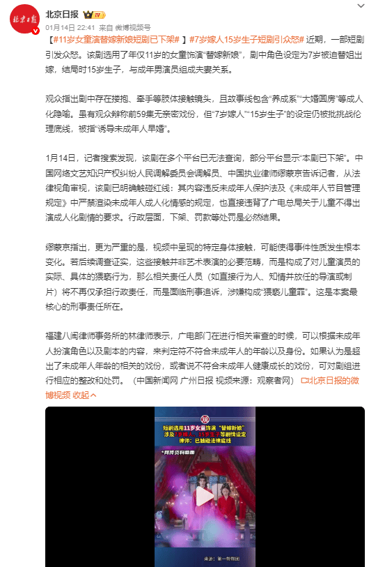 (来源:北京日报)近期,一部短剧引发众怒。该剧选用了年仅11岁的女童饰演“替嫁新娘”,剧中角色设定为7岁被迫替姐出嫁,结局时15岁生子,与成年男演员组成夫妻关系。观众指