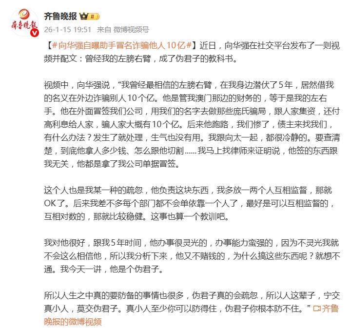 据1月16日报道,近日,向华强在社交平台发布的一则视频,直接让娱乐圈和财经圈同时炸了锅。视频里,这位江湖大佬面色凝重,亲自揭开一道陈年伤疤:他曾最信任的澳门财务助手,竟在身边潜