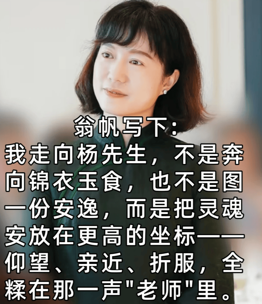 她也是再度发文,怀念了杨先生,并且还明确表示称-我走向杨先生,不是奔向锦衣玉食,也不是图一份安逸,而是把灵魂安放在更高的坐标