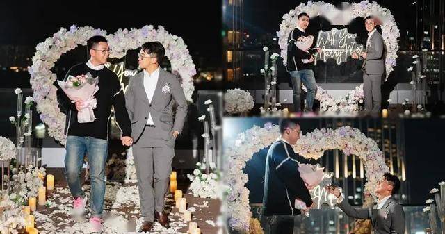 陈书君的订婚宴布置相当浪漫,他用白色鲜花铺成一条小路,两旁放满了蜡烛,而且还用鲜花砌成心型写有“Will You Merry Me”的巨型布景版。