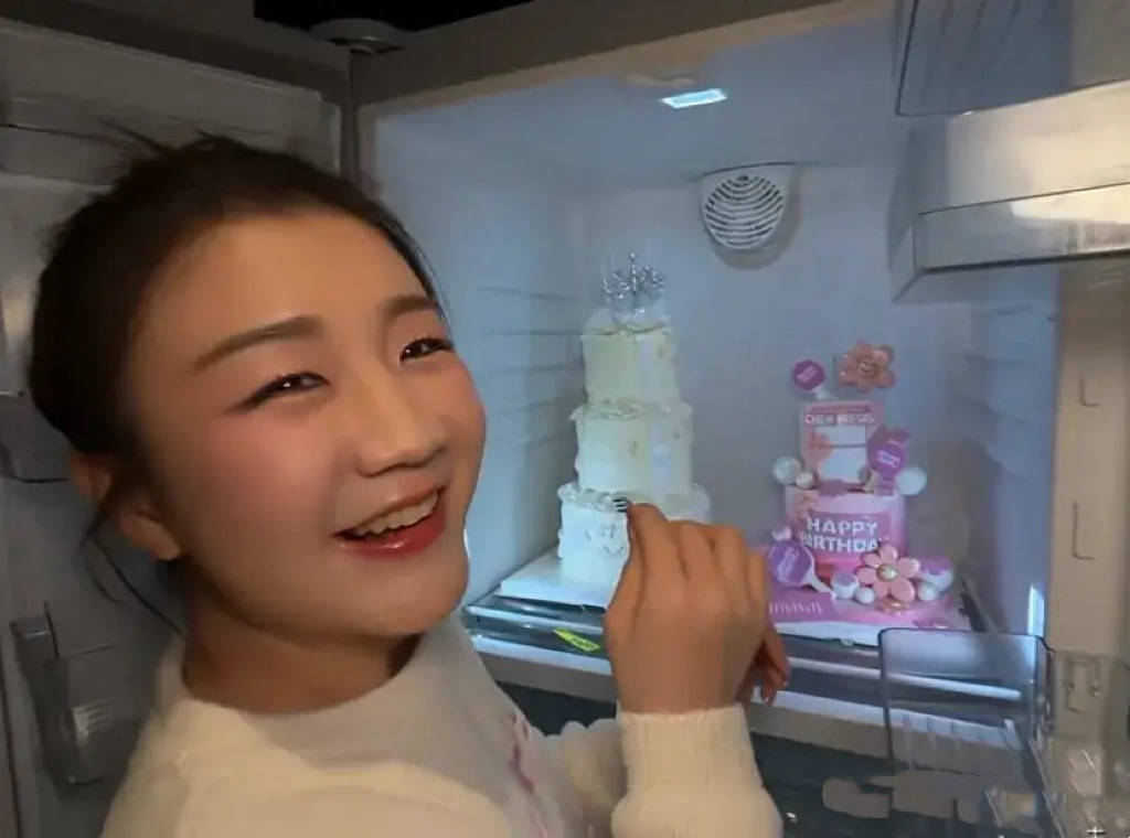 她打开冰箱门,我们看到了很精致的蛋糕,非常梦幻的多层蛋糕。