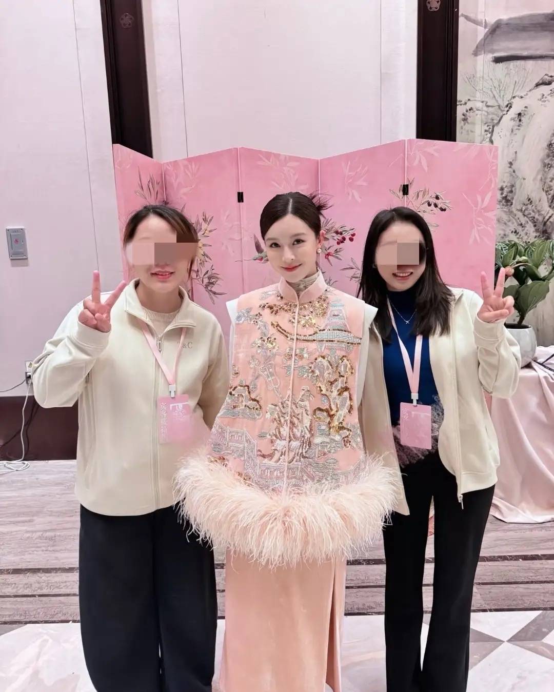 应邀赴约参加婚宴的文咏珊,穿了一套粉色新中式套裙,头发挽在脑后、温婉干净,笑容里多了几分慈爱。她戴着珍珠耳钉,脸上都是母性的光辉。产后的模样,明显温润柔和了。