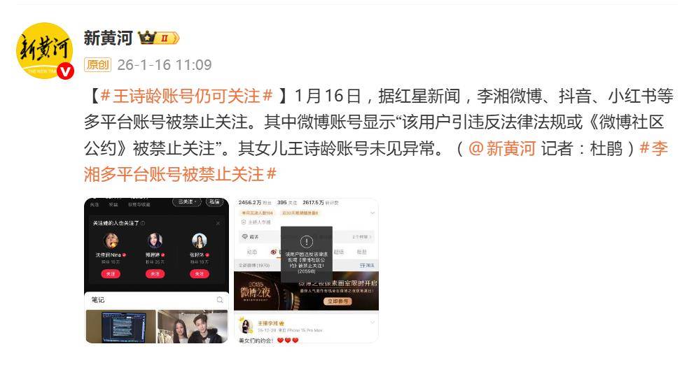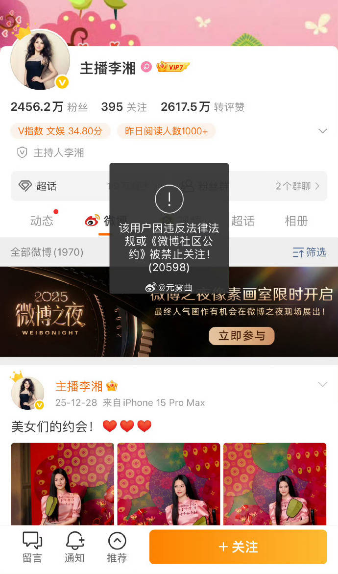 点进李湘的微博页面,一行醒目的官方提示赫然在列——“因违反法律法规或《微博社区公约》被禁止关注”。抖音和小红书的情况如出一辙,新粉丝的“关注”按钮彻底失灵。其抖音账号的最后动态,定格在2025年12月31日,那是一张女儿王诗龄与张艺兴的跨年合照,如今看来,更像是一场热闹落幕前的最后留影。