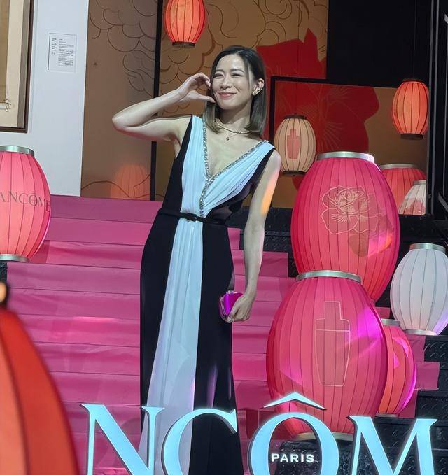 她穿了件黑白拼接的吊带长裙,腰线卡在最细的地方,深V领暴露好身材,走路时裙摆跟着步伐轻晃,脸上的腮红淡得刚好。