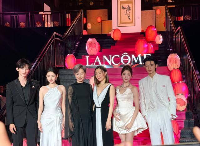 等所有明星站定,舞台上方的灯笼突然暗了一半,只留中间的主灯打在“兰蔻CNC展览”的标识上。