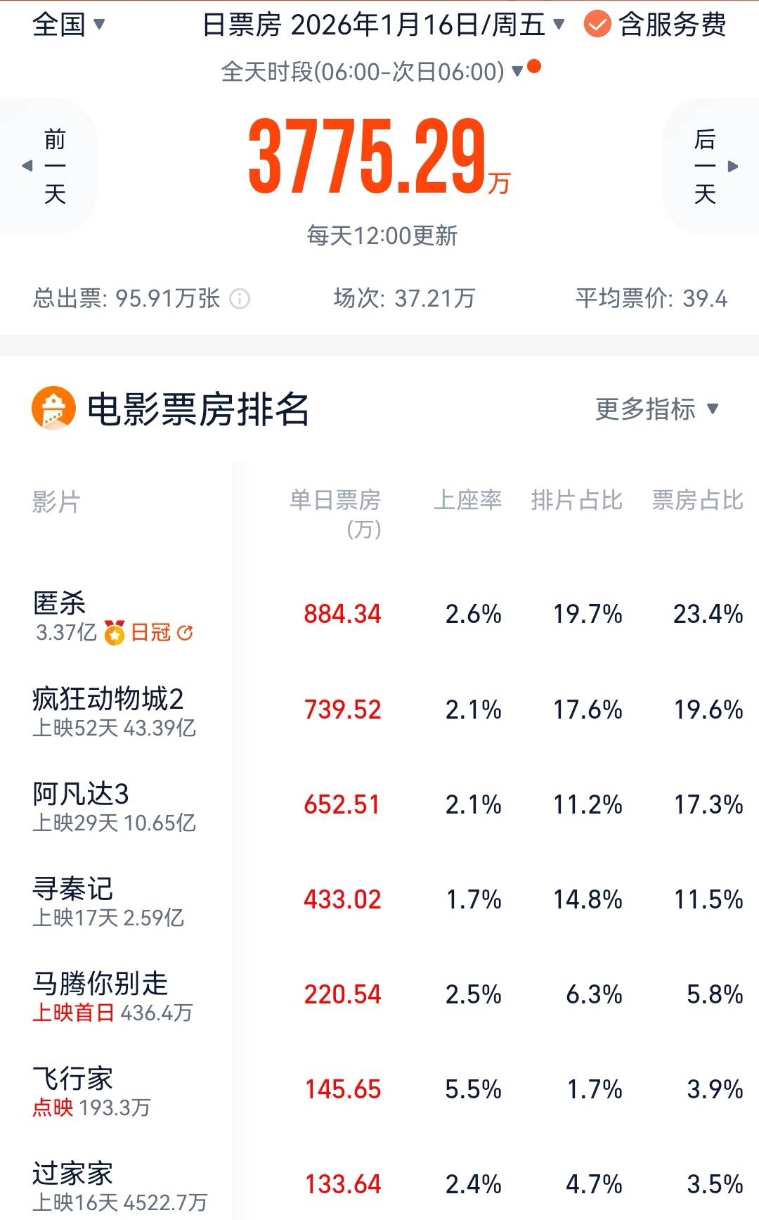 近日大盘走冷,当日票房最好的《匿杀》单日票房884万元,大盘票房3775万元。