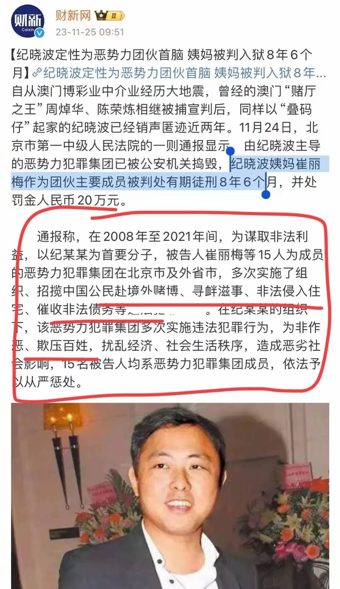 2023年,纪晓波被定性为恶势力犯罪集团首脑,崔丽杰的妹妹崔丽梅因非法经营罪被判刑入狱八年半,此时的崔丽杰却早早闻到了风声,卷款流亡海外。