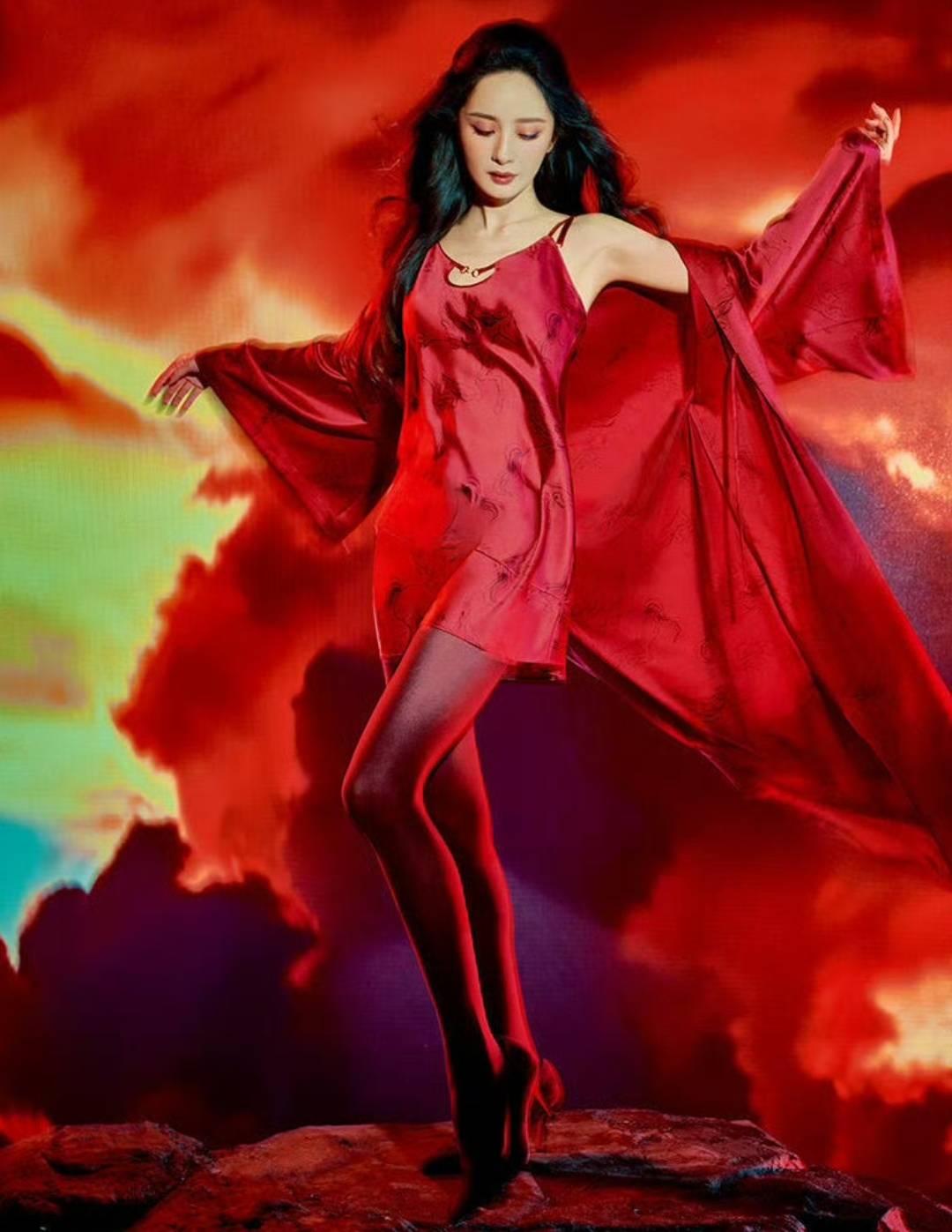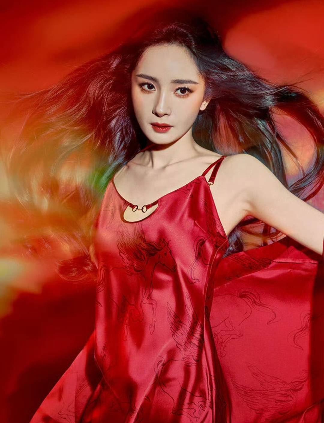 开年崩腾的马儿在喜庆的红色海洋飞驰,杨幂展现的动作也是充满动感与力量,深红色的红唇与主题相吻合,一头飘逸灵动的长发更是看起来妩媚迷人,