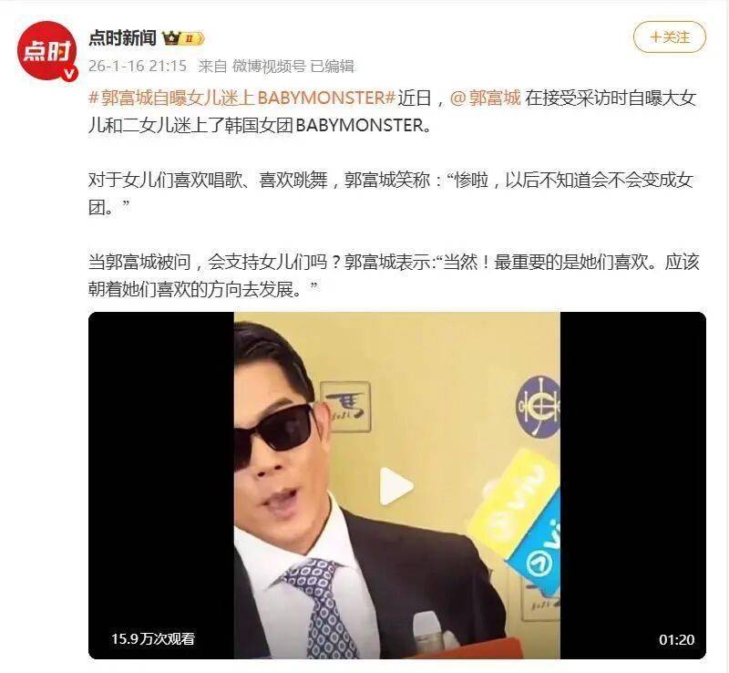 据1月16日报道,“天王”郭富城在采访中随口一句吐槽,瞬间戳中了无数老父亲的笑点与痛点。他笑着透露,自家两个宝贝女儿彻底迷上了韩国当红女团BABYMONSTER,在家设镜