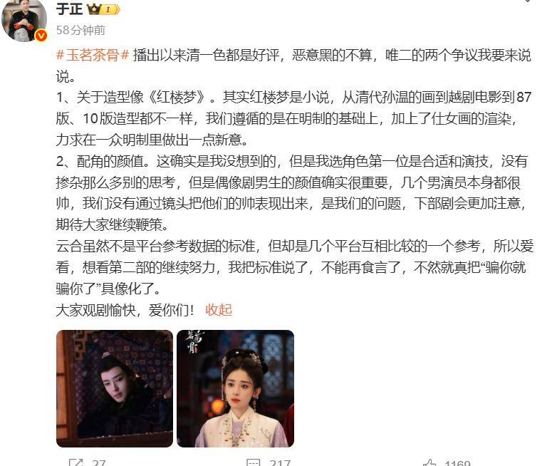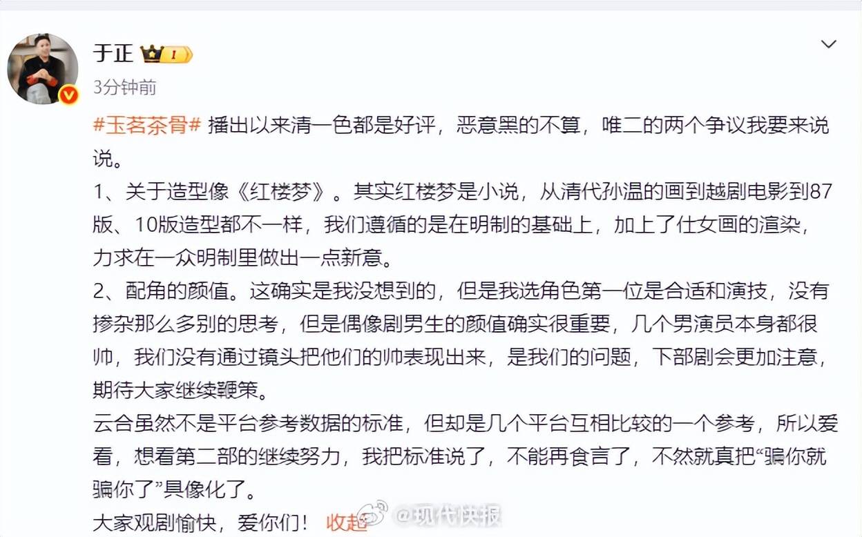 “第一位是合适和演技,没有掺杂那么多别的思考。”1月17日,制片人于正在回应新剧《玉茗茶骨》配角颜值争议时,再次明确了他的选角标准。但他随即补充的一句“