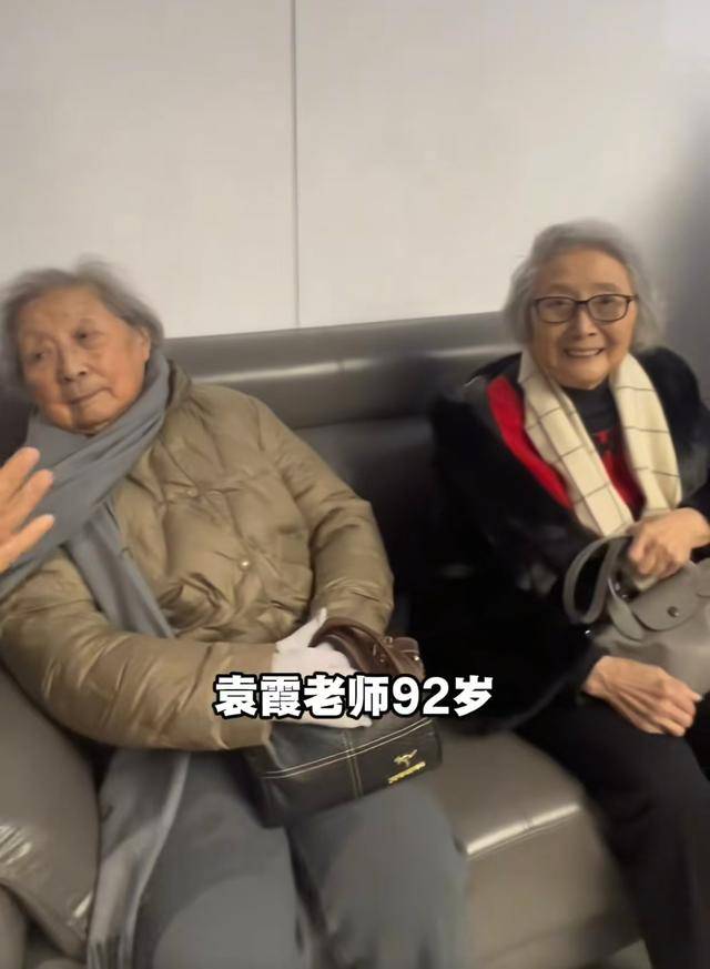 师伟左手边的袁霞也92岁了,她乐呵呵的看着镜头,虽然穿了一身黑,但上衣的内衬是红色,围巾是白色,点缀的恰到好处。