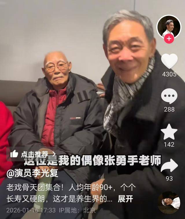 1月16号,李光复乐呵呵的发了段视频,“老戏骨天团集合,人均年龄90+,个个长寿又硬朗”,将他们称为养生界的天花板。