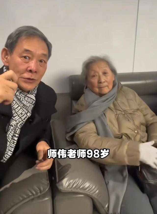 师伟已经98岁,不同于李明启的明艳穿着,师伟的打扮非常普通,甚至还戴了副白手套。