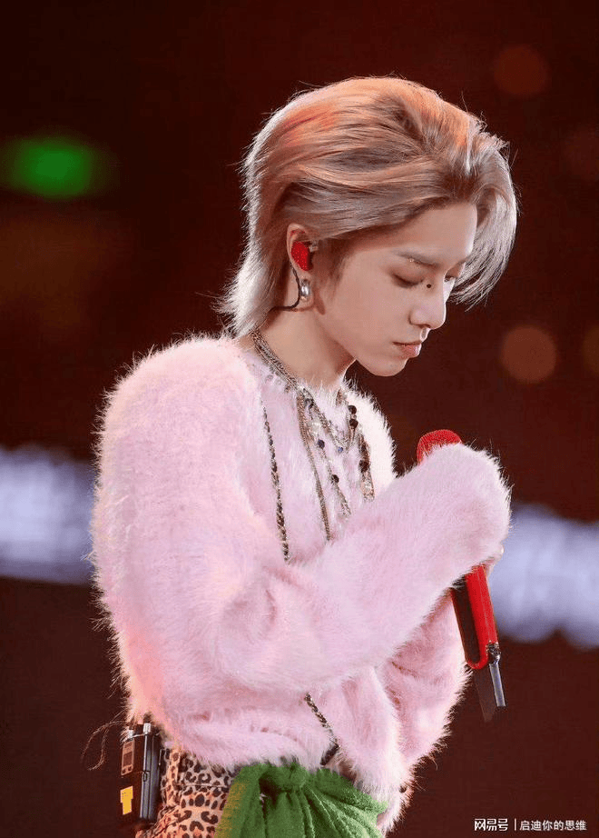 其实早在彩排路透里,他就穿着同款女装在后台蹦迪,还对镜头解释:“这不是反串,是‘自我溶解’。我想看看当‘性别’被拿掉后,音乐还剩什么。”为了这套造型,团队请来《乘风破浪》的妆发总监,光假发就试了 12 顶,最后选定日本 V 牌高温丝,每天要用 3 小时漂染成“落日金”,再喷 4 层固色胶,才保证在 30℃ 的户外场不塌不蔫。豹纹皮裤更是意大利定制,0.4 mm 超薄小羊皮,里衬缝了 60 颗 Swarovski 水晶,保证他一抬腿就能闪成迪斯科球。