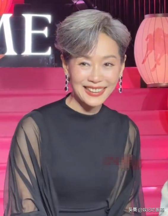 在一刀切的发型下,笑起来嘴角有褶子,但说明在遵循自然老去,而状态不能说不好,反而像40岁的状态。