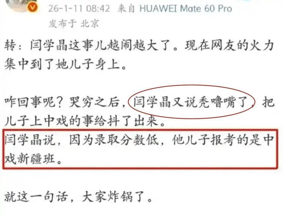 事情还在发酵过程中时,就有网友开始深扒闫学晶儿子的履历了。