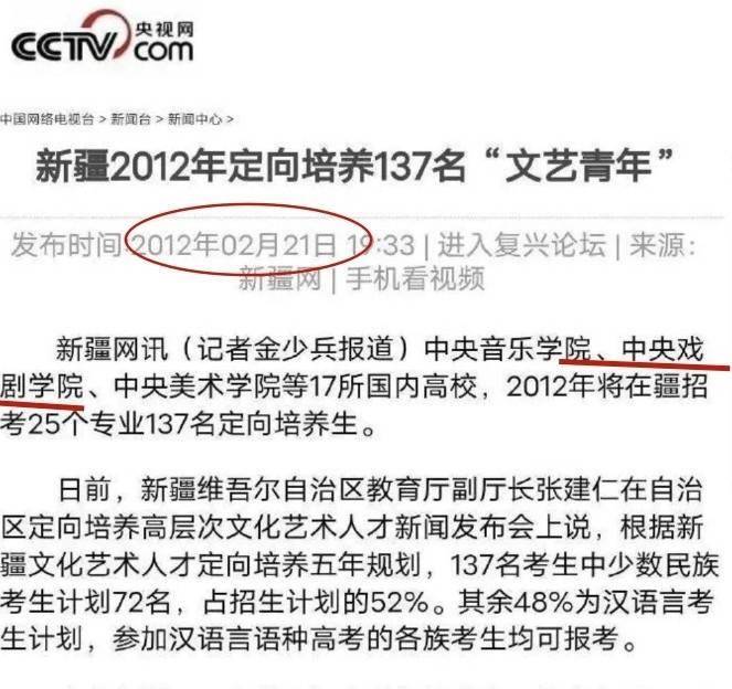在贴出的旧闻截图里,可以清晰地看到“中央戏剧学院”几个大字,出现在2012年新疆定向培养招生院校的名单里。