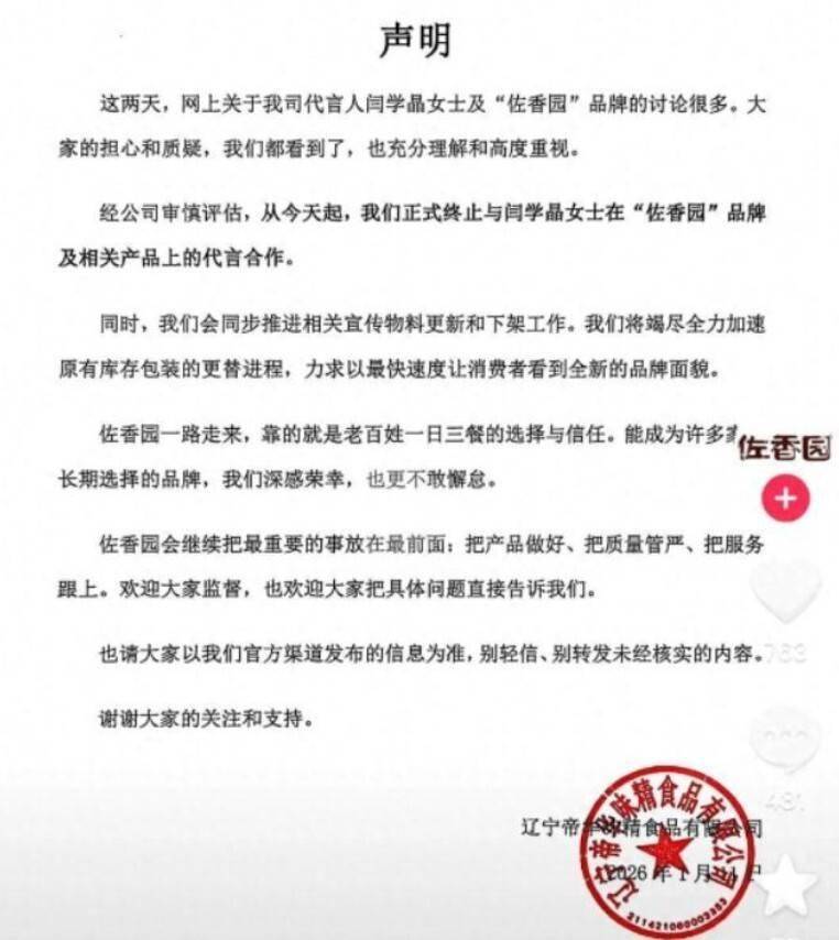 首先作出回应的是东北某个本土品牌,在重重压力之下于1月11日发出声明,宣布终止与闫学晶在相关产品上的代言合作。
