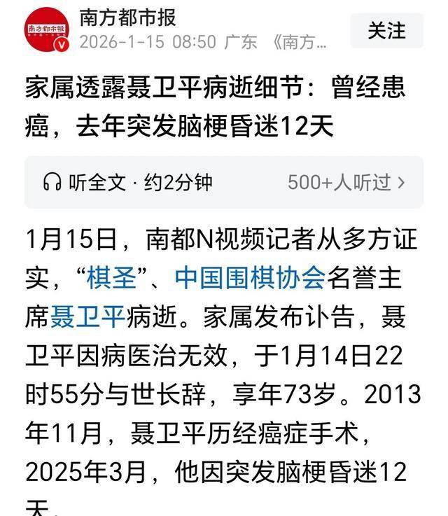 2026年1月14日深夜,一则消息在网络上迅速传开:棋圣聂卫平在北京病逝,享年74岁。