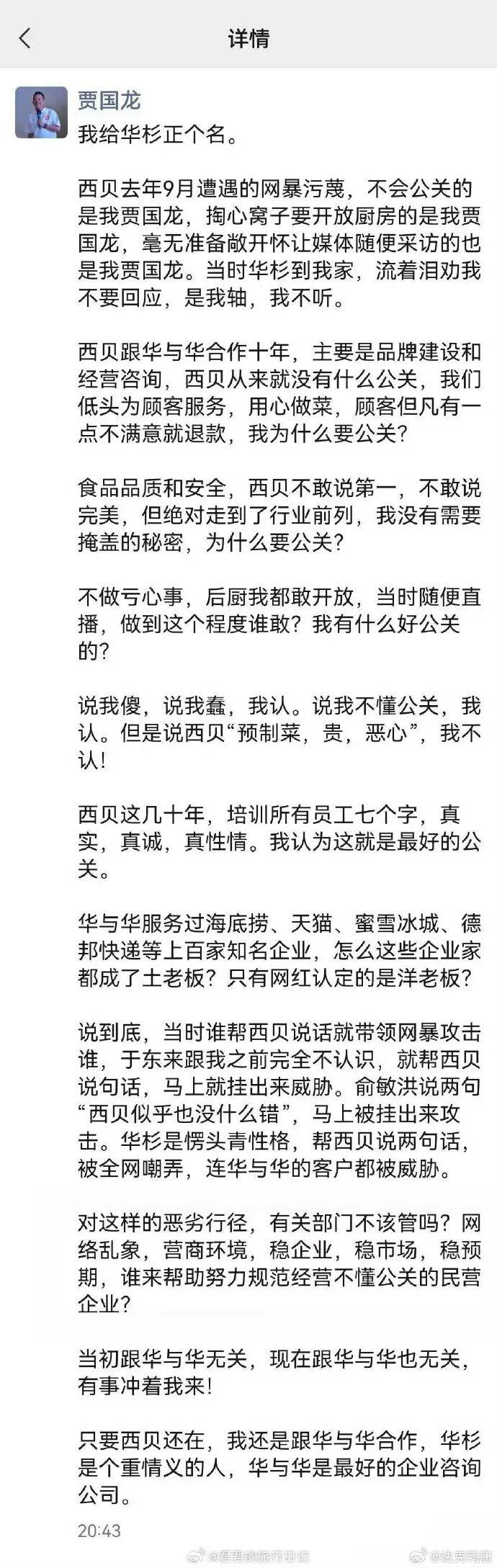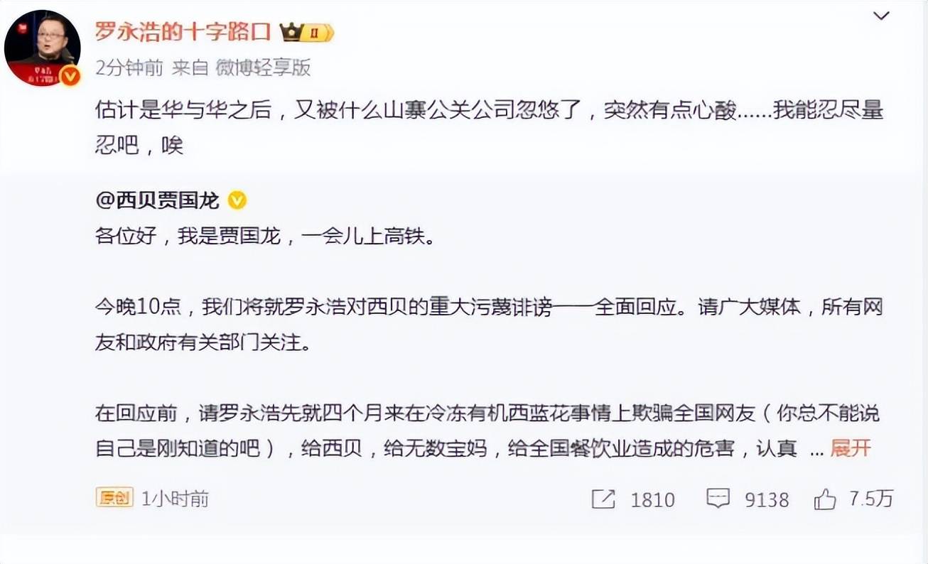 接着贾国龙用小号炮轰罗永浩污蔑政府、污蔑司法,请罗永浩先就四个月来在冷冻有机西蓝花事情上欺骗全国网友(你总不能说自己是刚知道的吧),给西贝、给无数宝妈、给全国餐饮业造成的危害,认真道歉,并赔偿相应损失。