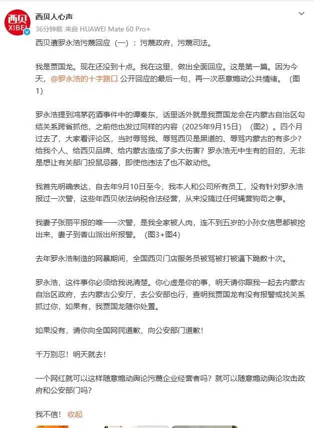 贾国龙要求罗永浩向"无数宝妈和餐饮业"道歉赔偿,预告1月16日晚10点"全面回应",并指控其网暴致西贝员工"被逼下跪数十次"。