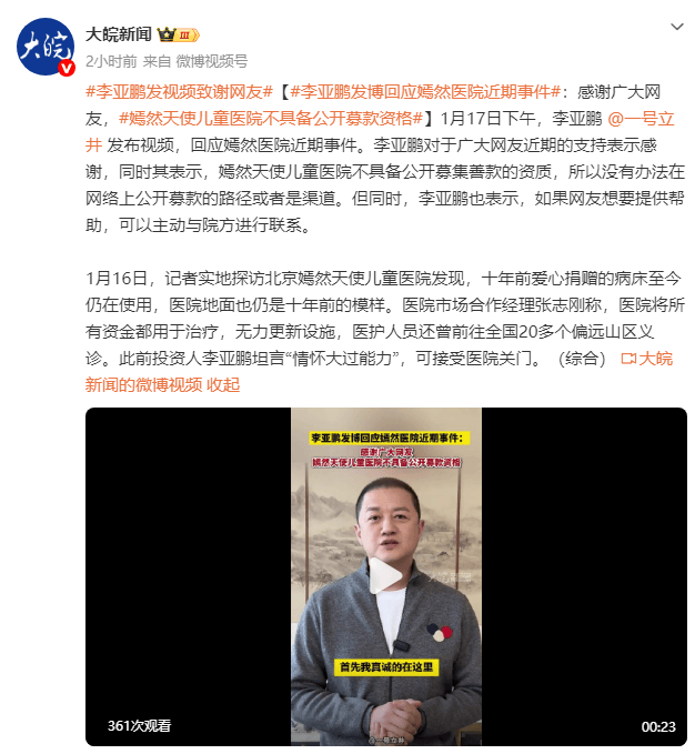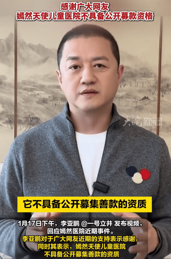 (来源:大皖新闻)1月17日下午,李亚鹏发布视频,回应嫣然医院近期事件。李亚鹏对于广大网友近期的支持表示感谢,同时其表示,嫣然天使儿童医院不具备公开募集善款的资质,所以没有办法在