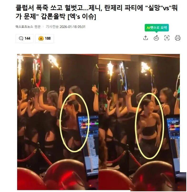 据1月18日韩媒最新报道,一段不足一分钟的生日派对视频,让BLACKPINK成员Jennie再度站上了风口浪尖。17日,一段标注为“在日本为Jennie庆生”的视频在社交平台X上流传开来,其中喧闹的音乐、炫目的火花以及颇具争议的着装,迅速引爆了一场关于偶像行为边界、女性形象与安全责任的网络激辩。