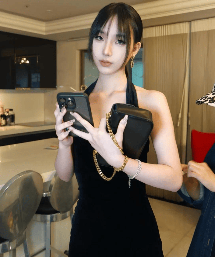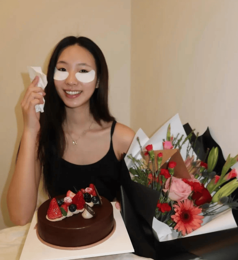 20岁的Elly穿着黑色低胸吊带满脸的高级感,锁骨明显,配牛仔裤非常的少女,一个草莓巧克力蛋糕和一束鲜花,脖子上有带着姨妈大S送的Tiffany项链,一戴就是10年,生日也有好好吃饭,和男朋友一起下馆子各种凹造型拍照。